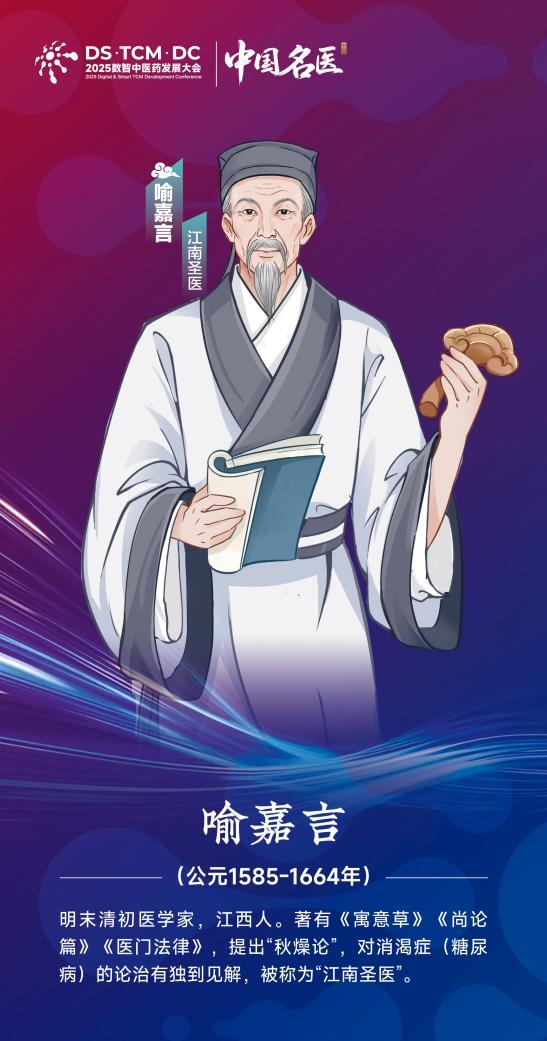 喻嘉言(1585—1664),江西南昌新建人,明末清初著名医学家。所著《寓意草》《尚论篇》《医门法律》被各国医学家推崇;建立“三纲学说”;创立千古名方“清燥救肺汤”;提出“秋燥论”;制定议病式,主张议病后再开方,开出世界第一张处方,是中医“一人一方”的重要来源;建立世界第一所规范的中医国医学堂;早西方200多年创立“误诊学”;重整《伤寒论》,将错简、遗漏的《伤寒论》重新整理、撰写;对世界医学影响与贡献巨大,被世人尊称为“江南圣医”。